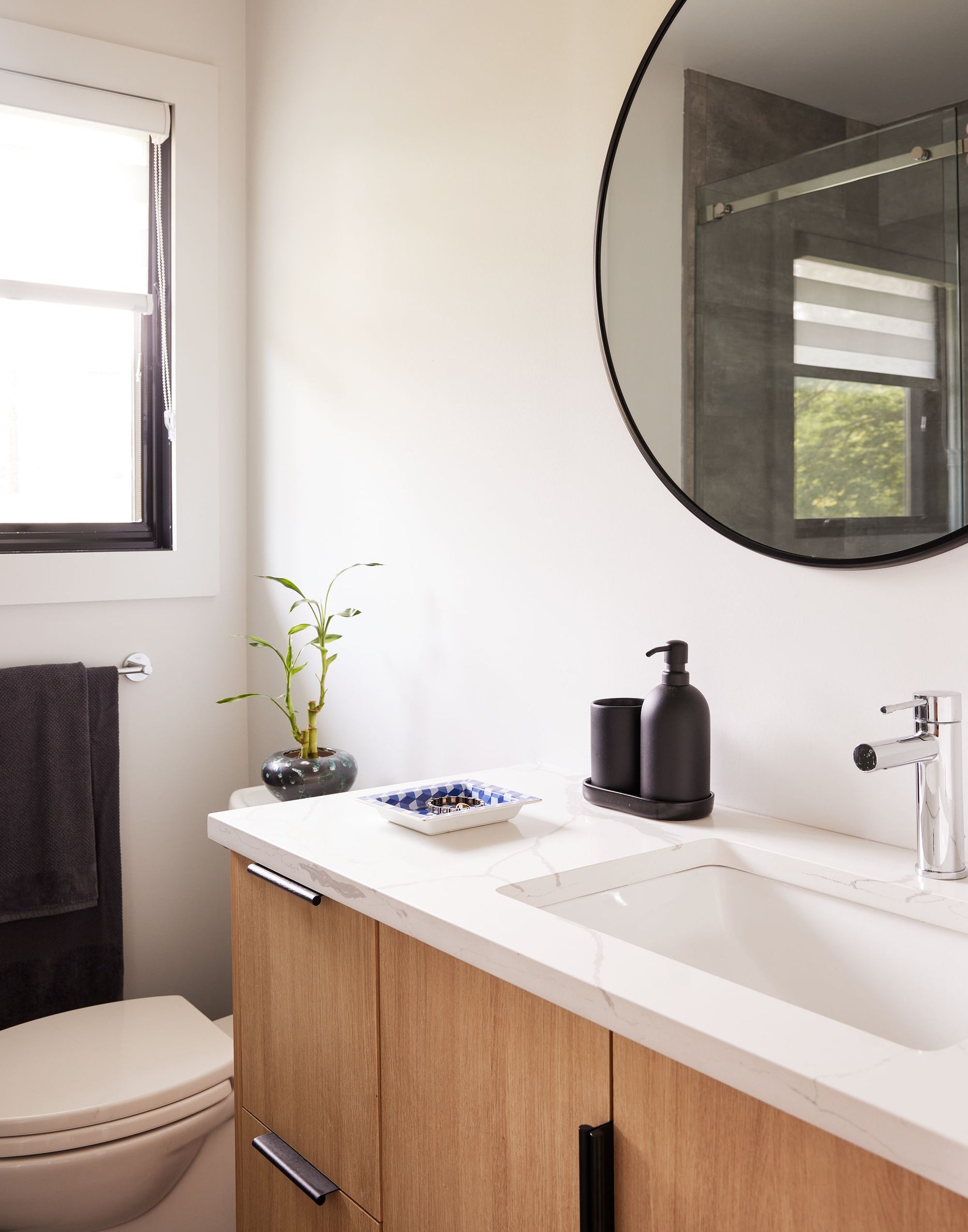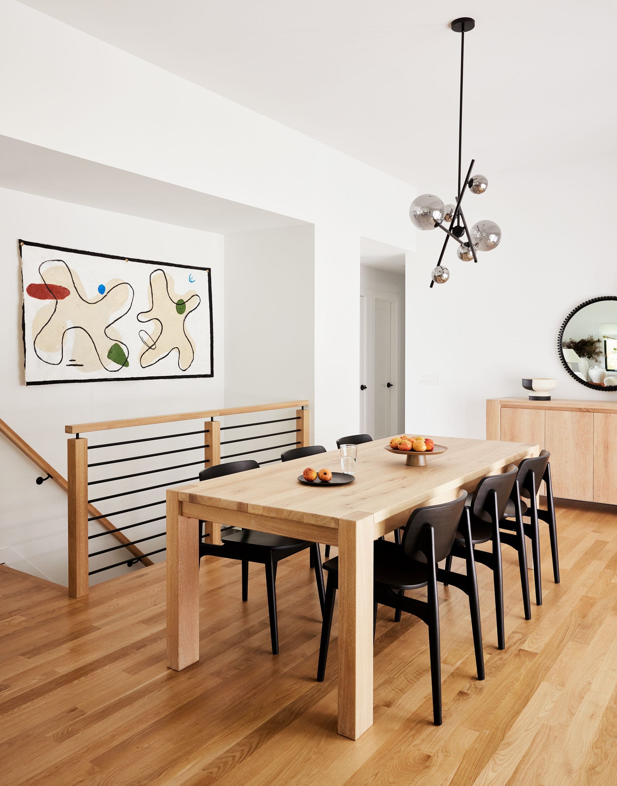 The centerpiece — a wood dining table that brings nature inside — not only serves as a functional area but also as the perfect gathering spot for family and friends. Matte black dining chairs make this open space a vibrant and luxurious retreat from the city's hustle and bustle.
